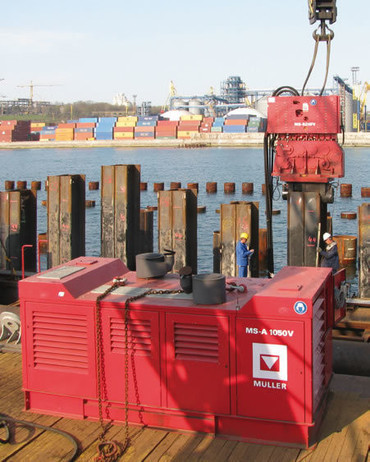 Высокочастотный безрезонансный вибропогужатель с изменяемой частотой для погружения и извлечения шпунта Ларсена.